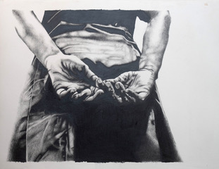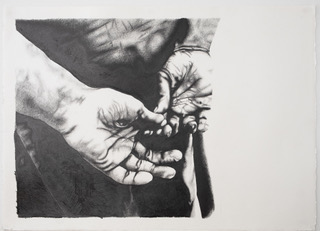 These two drawings portray ICU ward nurses hands relaxing. Each graphite on paper with a grain drawing takes up to six months to create and measures 1.2/1m.